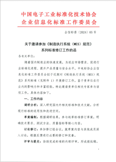 关于邀请参加《制造执行系统(MES)规范》系列标准修订工作的函
