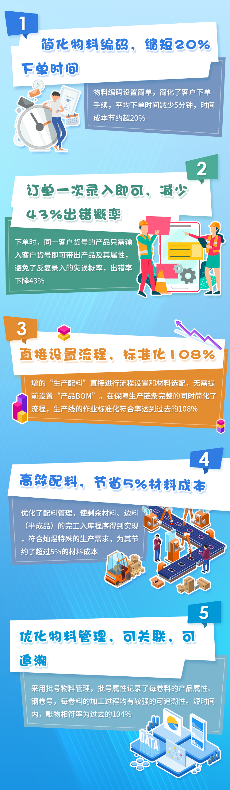 优化了配料管理,使剩余材料、边料(半成品)的完工入库程序得到实现,符合灿煜特殊的生产需求,为其节约了超过5%的材料成本