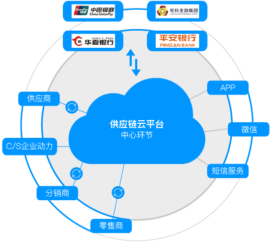 以供应链云平台为中心环节,将供应商、制造商、分销商、零售商、最终用户整合为环环相扣的“供应链”,由“资金流”贯穿成为市场圈,配合APP、微信等多种移动应用终端,将有望成为国内中小企业融资难问题的有效解决方案。