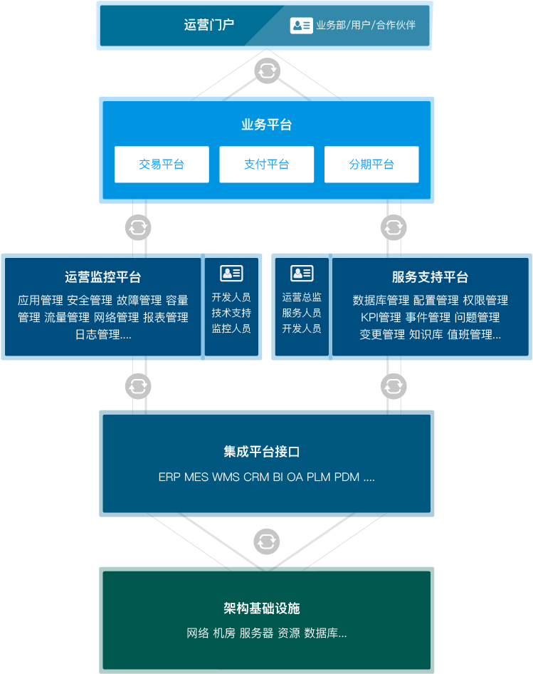 东信达的运维服务架构主要由运营门户、业务平台、运营监控平台、服务支持平台、集成平台接品及基础设施组成,向用户提供基于互联网和移动互联的统一管理访问入口,方便的实现对用户、业务部门、上下游企业交易和支付往来的综合运维管理。