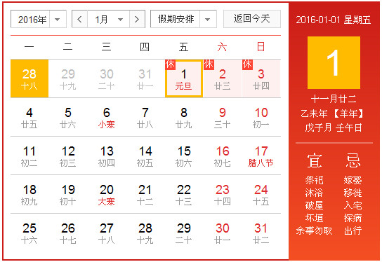 2016年1月1日至1月3日放假,共3天。1月1日(星期五)为国家法定节假日,1月4日星期一正常上班。