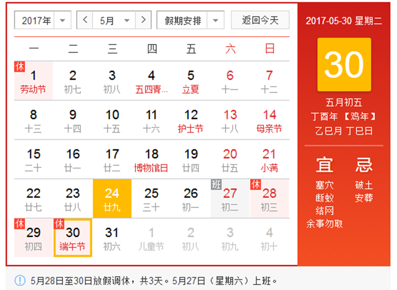 根据《国务院办公厅关于2017年部分节假日安排的通知》精神,结合我公司实际情况,现将我公司2017年端午节节放假调休日期的具体安排通知如下。