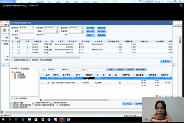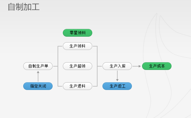 (1)自制加工方面,主要对生产单、领料流程、领料模式、生产退料流程、生产超领流程等方面进行了具体的操作演示。
