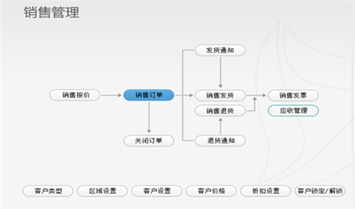 • 通常情况下,企业销售人员给前来咨询价格的客户报价,客户觉得价格合理便给企业下销售订货单,销售人员开具发货通知单通知仓库人员给客户发货,仓库人员在接到通知单后按照通知数量、地址给 客户发货并产生应收帐,客户收到货物后付款,企业出纳人员录制收款单。
