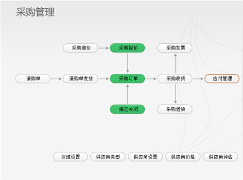 • 企业人员根据实际需求录制请购单向上级请求采购物品,管理人员在接到请购单后审阅给采购部下发采购任务单,供应商送货过来后仓库人员进行收货并产生应付帐,出纳人员根据应付帐单信息向供应商付款。