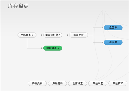 • 进行仓库盘点作业的流程基本上为:企业在月末时制定盘点计划,在仓库盘点管理模块中生成盘点卡,在对仓库中的物料进行清点后得出物料在仓库中的实际库存数量,并将数据录入到盘点卡中,最后进行库存更新,系统将自动生成相应的盘盈单和盘亏单调整库存数量。