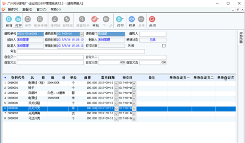 请购单作用,一般分两种请购类型,一种为针对零星物资的请购,一种为针对安全库存进行的请购,区别为前者需要请购人员自行开单,后者可由安全库存预警功能自动产生。应用,请购单仅需注意料号的选择与数量,需求日期等关键信息,流程上需与采购部进行确认发放。