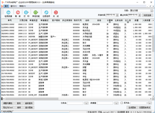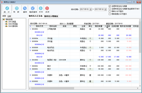 《出入帐统计》记录着系统中所有物料的出入库情况, 可查看物料详细的出入库数量情况。