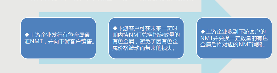 为解决有色金属生产各环节的资金短缺问题,上游企业可基于区块链技术发行有色金属通证(Non-ferrous Metal Token,NMT),实现基于供应链的融资。