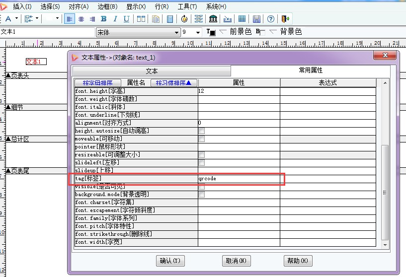4、切换到“常用属性”分页,找到“tag(标签)”属性,于其对应的属性框中输入“qrcode(表达式)”(全英文输入):