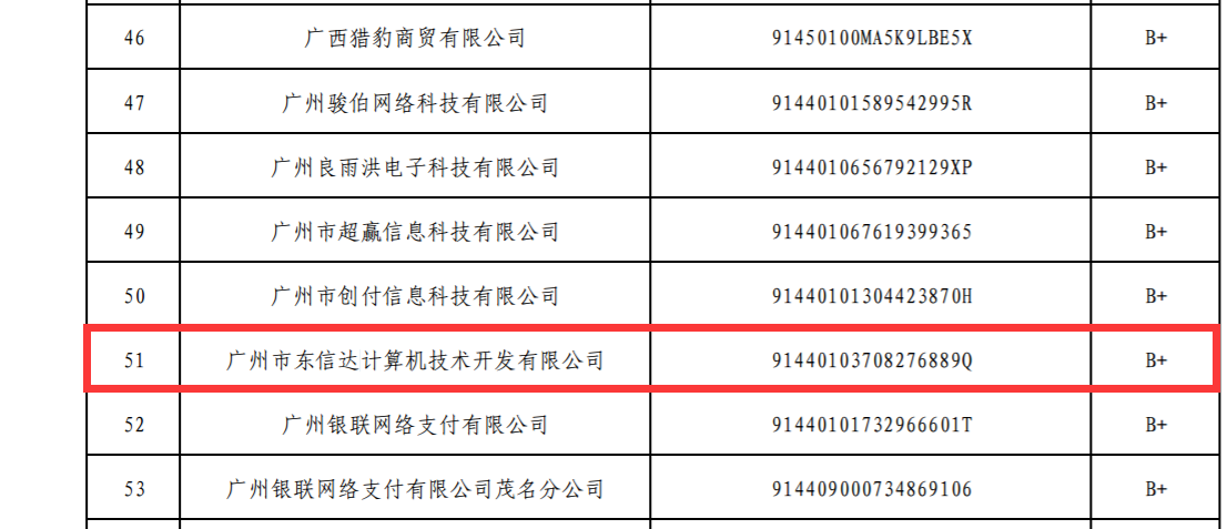 厉害了东信达,喜获中国支付清算协会收单外包服务B+评级!