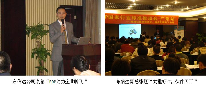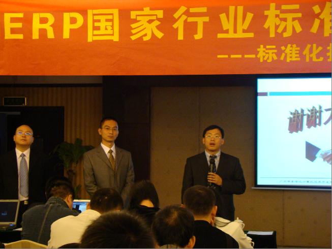 2008年12月26日,“ERP国家行业标准推动会(广州站)”在广州市广武酒店贵宾厅二楼隆重召开。广东省信息产业厅领导到会并致辞,中国电子工业标准化技术协会副秘书长邓超到会并演讲。广东省生产力促进中心、华南理工大学、中山大学、荔湾区科技局,以及80多家企业界、IT界同行共100多人的代表出席了本次会议。