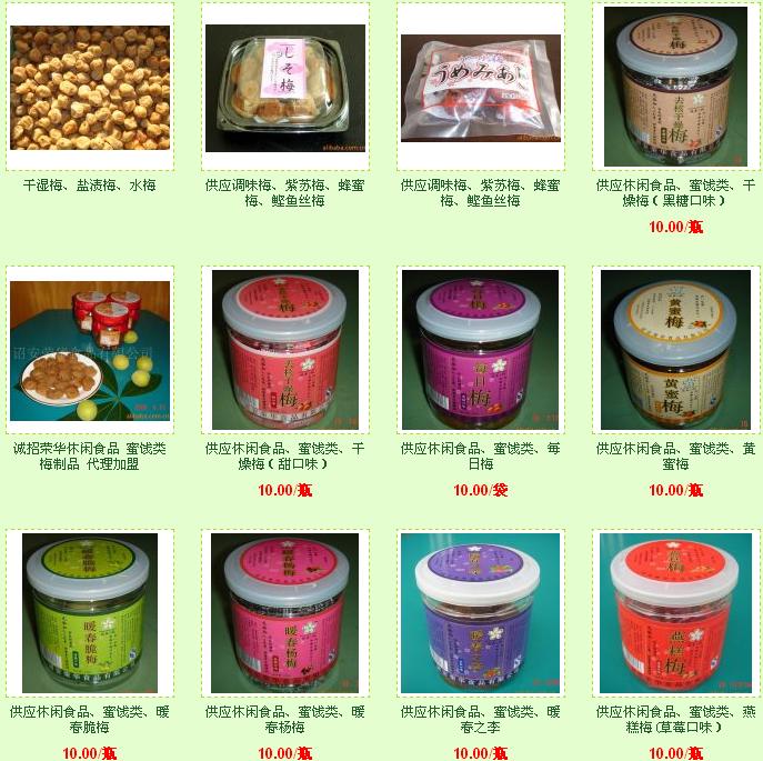 公司主要经营产品:青梅、干湿梅、盐渍梅、梅干、青口梅、脆梅、黄蜜梅、调味梅、紫苏梅、蜂蜜梅、鲣鱼丝梅、去核干燥梅、梅果酱、青梅酒等。现年出口量12000吨。公司占地面积113220M2,员工人数420人,其中技术人员35人、管理人员26人。公司拥有全封闭的无尘生产车间、无菌仓库,并采用日本进口的先进生产设备。