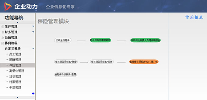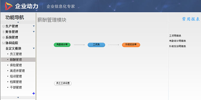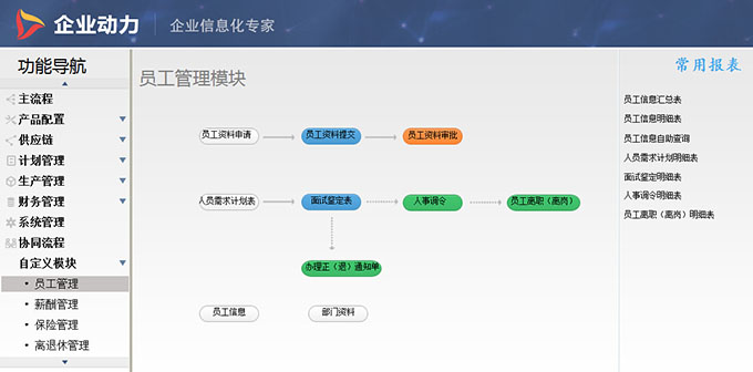 某国营企业的人力资源流程,由于是老国营单据,涉及范围广、功能繁琐,个性化要求非常高。根据企业的实际情况,启用企业动力智能开发平台开发了员工管理、薪酬管理、保险管理、离退休管理、培训管理、档案管理和干部管理、车辆管理等流程: