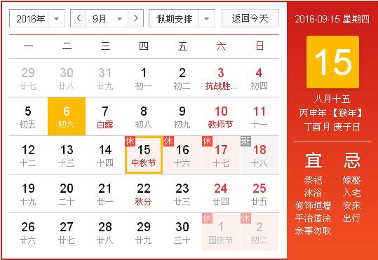 2016年中秋节放假安排:2016年9月15日(星期四)至9月17日(星期六)。9月18日(星期日)公休调至9月16日(星期五),2016年9月18日(星期日)照常上班。